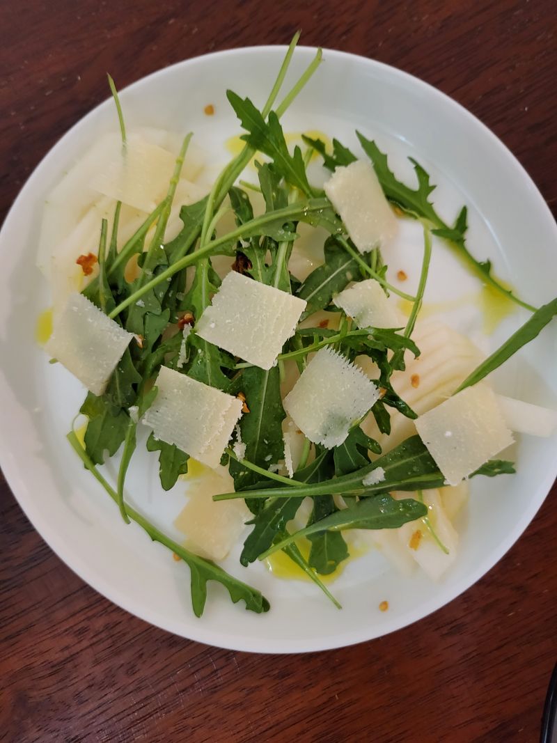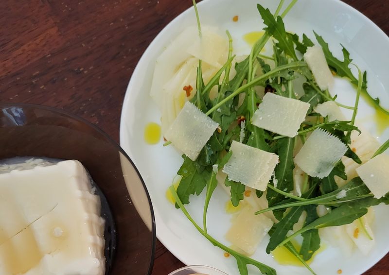 참외, 소금, 올리브유, 루꼴라만 있으면 되고요. 추가로 파마산 치즈가 더해지면 보기가 좋아지더라구요.(매콤한 걸 좋아하시면 페퍼론치노를 부셔서 뿌리면 좋아요)
