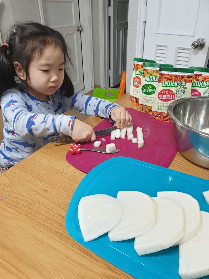 우리 아이 첫 깍두기 담그는 실력 좀 보실래요? 새미네 부엌 깍두기 양념 덕분에 무만 썰어서 준비하면 오케이~~ 열심히 칼집하고 내가 썬 무 맛도 보면서 즐겁게 만든 요리 시간이었습니다 ^^