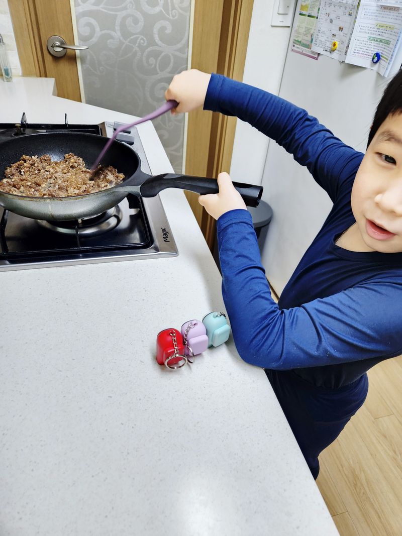아직 키가 안되는 우리막둥이는 스스로 디딤대를 챙겨와서 요리해요😊