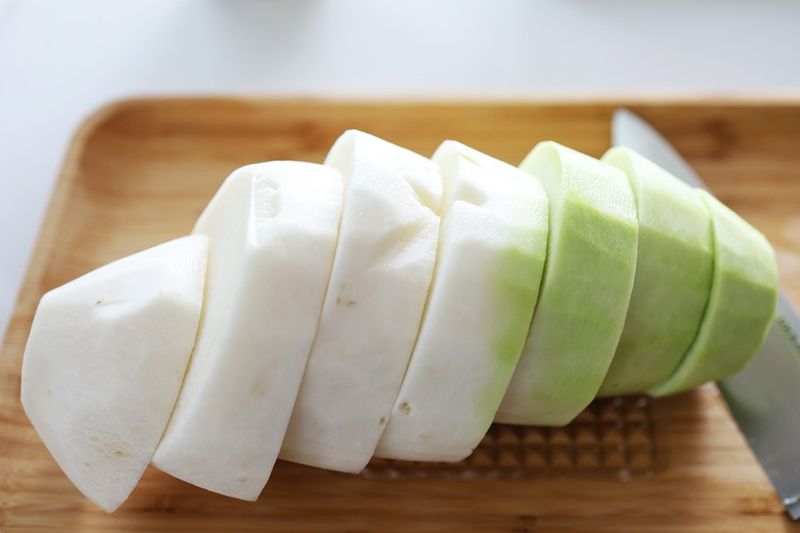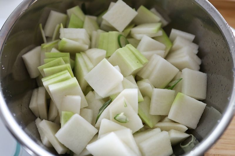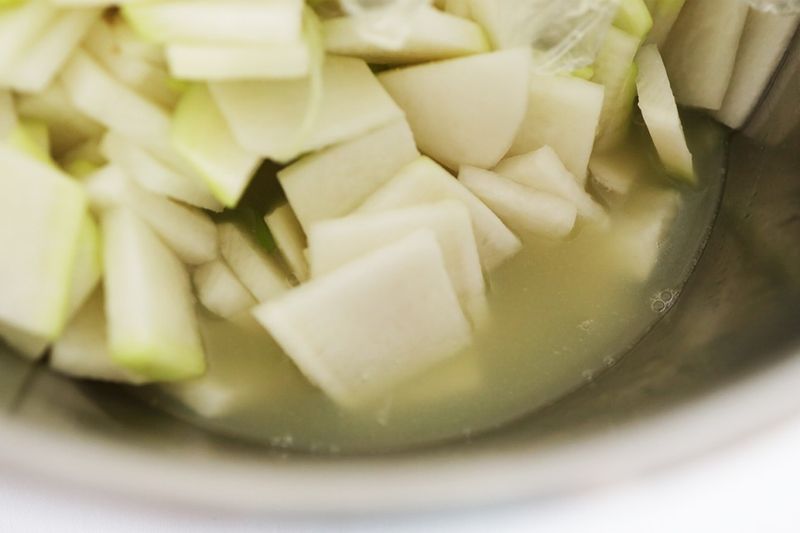 무를 나박썰기한 후에 큰 용기에 담고 새미네부엌 물김치양념 한 팩을 부어준 후 그대로 한시간 기다리기,