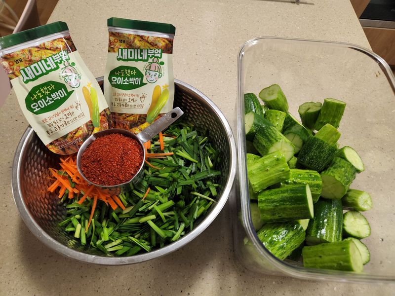 3. 새 미네 오이소박이 양념, 오이, 부추, 고춧가루 넣고 버무리기