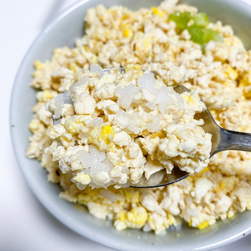 두부는 포크로만 눌러서 으깼어요 두부의 각진 형태만 없앤다는 느낌으로 살살 으깼구요 살짝 기름 두른 팬에서 볶다보면 두부가 동글동글 하게 수분이 날아가며 작게 뭉쳐지거든요 그때 다른 간 필요없이 연두를 좀 넣어주시면 되요 이때 미리 풀어둔 달걀이랑 밥도 함께 넣어서 볶아주시는게 요리법 연구소의 레시피예요