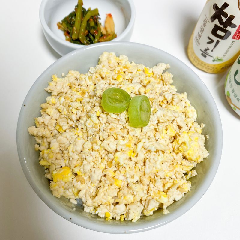 전 덮밥처럼 먹고 싶어서 두부 볶은 것에 달걀, 연두만 넣어 함께 볶은 뒤 밥 위에 올려서 완성했어요:)