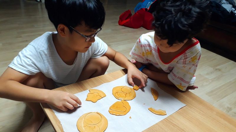 오징어게임으로 한바탕 인기몰이한 달고나 만들기! 급한데로 국자에 슈퍼에서 급히 사온 소다로 신나게 만들고 주먹밥 틀로 모양 찍기! 쉽게 도전하지 못하고 형아 성공을 기원하며 바라보는 동생~~~ 온 집안에 단내가 풀풀~~~~^^