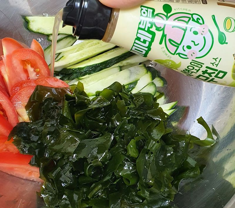 오늘은 미역오이초무침소스로 미역오이토마토냉채를 만들었어요♡