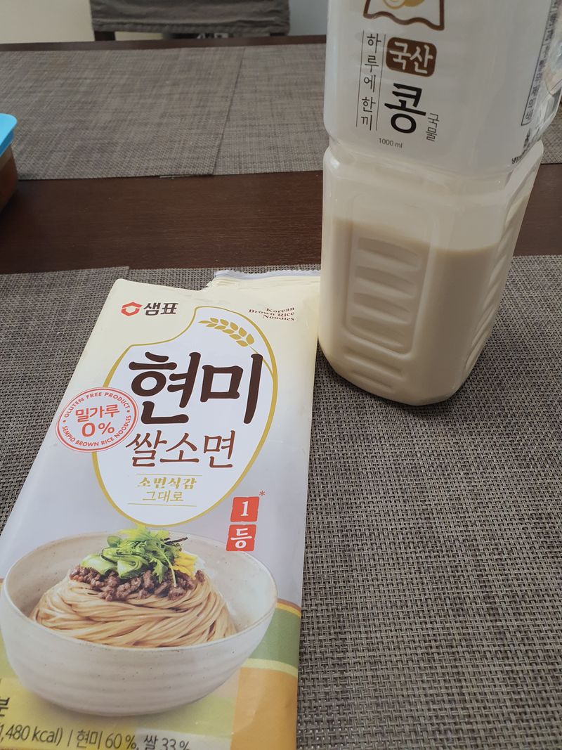 일요일 점심 뭐먹을까 고민하던차에 집 앞 오아시스마트에서 유기농콩국물 세일한다는 문자받고 후다닥 사와서 집에 있던 샘표 현미쌀소면 삶아서 바로 먹었어요. 밀가루가 한 방울도 안들어갔다는 현미쌀소면 정말 쫄깃하고 맛있네요.