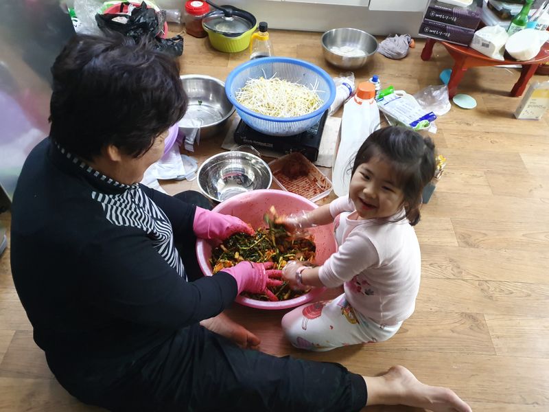 외할머니와 함께 김치담그기 할머니가 김치 담그시니 하고싶어서 옆에 앉아 조물조물 하면서 맛도보고 매워도 맛있다며 재미있게 만들고 있어요