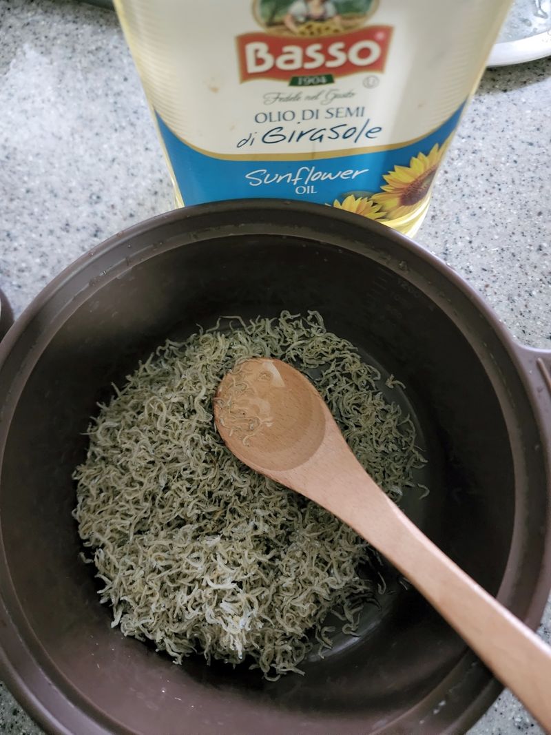 먼저 전자레인지 그릇에 멸치와 포도씨유를 넣고