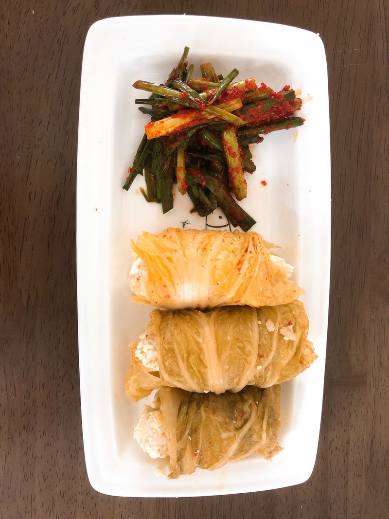두부밥을 동그랗게 만들어 김치로 말아보았습니다