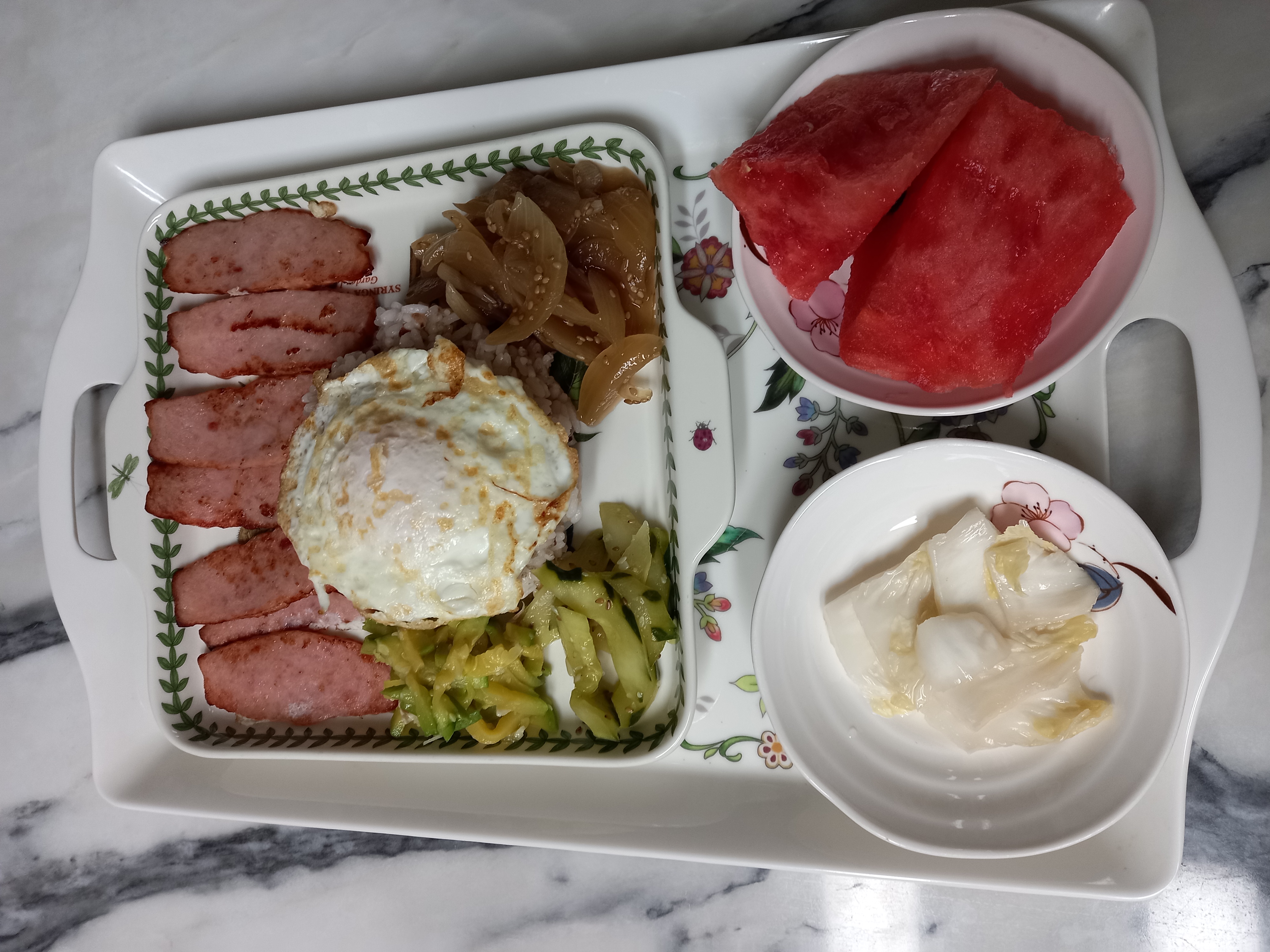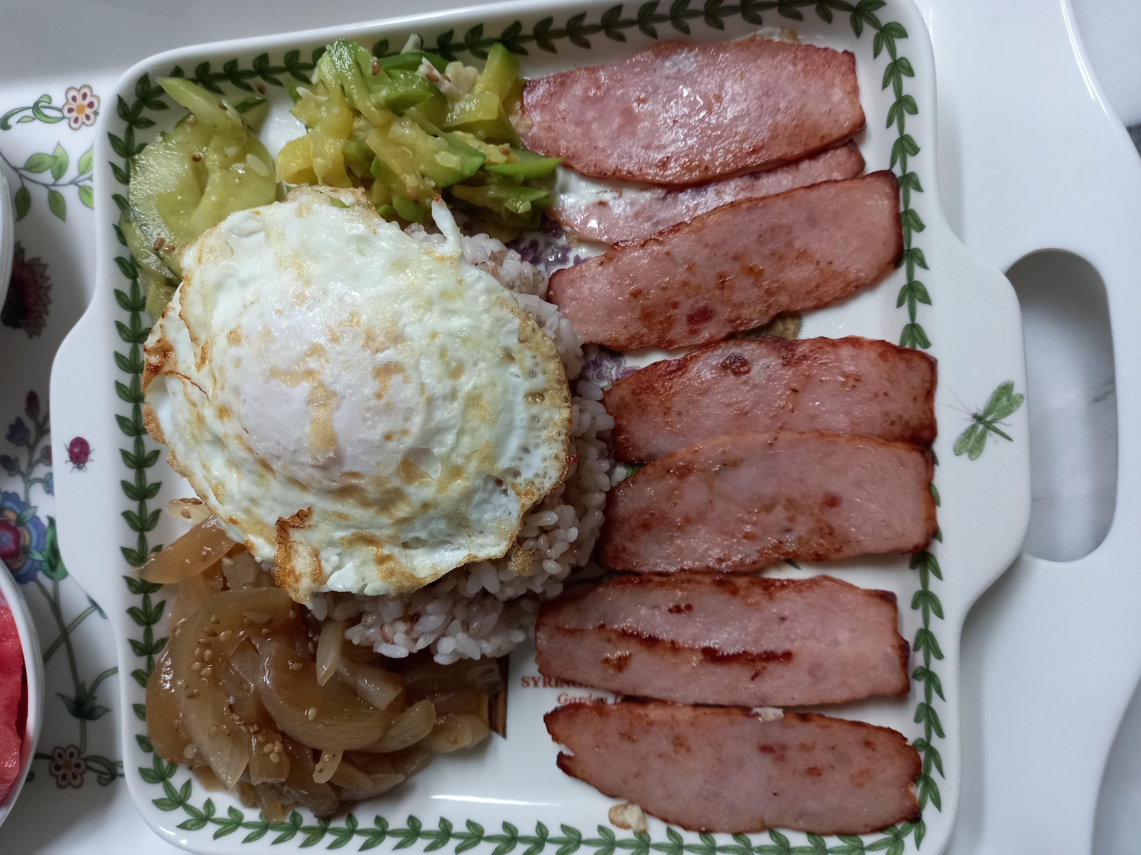 호박나물, 양파볶음,오이나물에 오븐그릴햄, 후라이하나 올린 한접시요리
