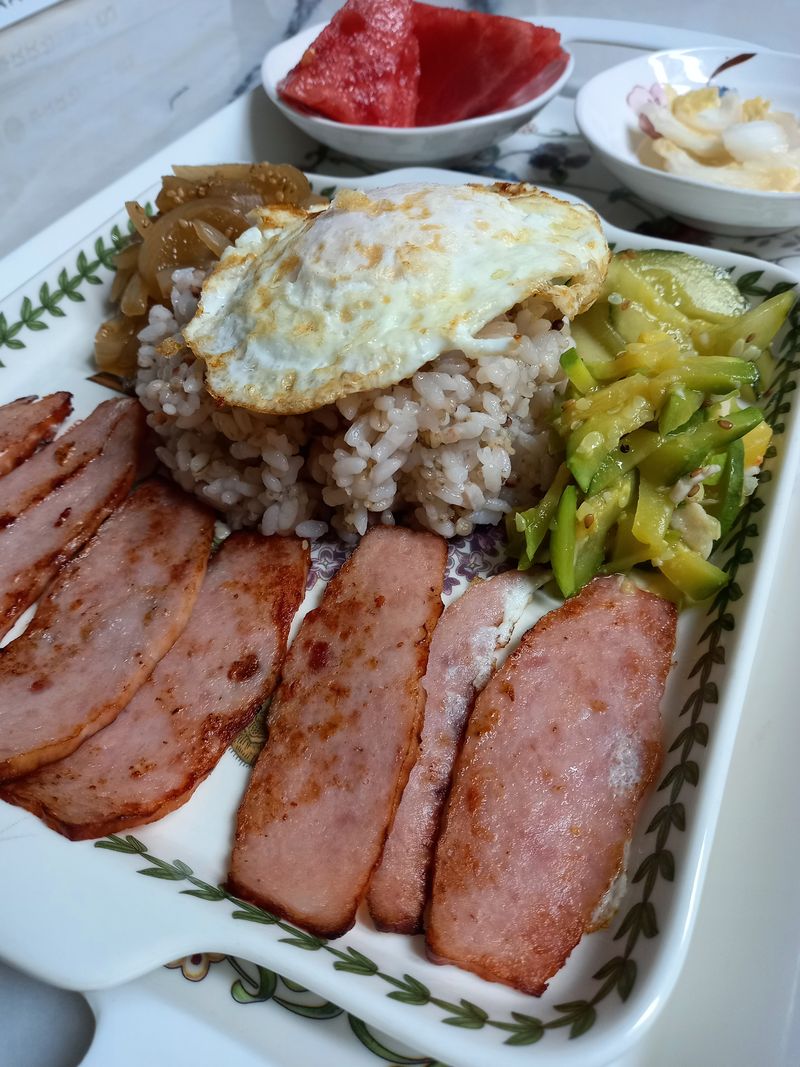호박나물, 양파볶음,오이나물에 오븐그릴햄, 후라이하나 올린 한접시요리