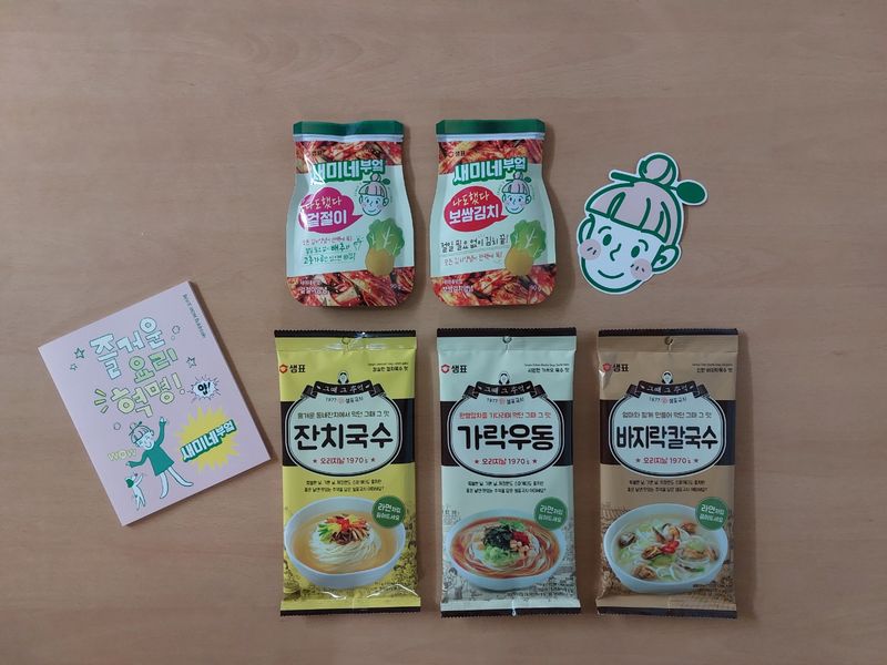 지난 달에 ‘새미네부엌 플랫폼’의 ‘요리? 해봐야 알지! 김치 편’ 이벤트에 당첨되어 ‘겉절이파 꾸러미’를 선물로 받게 되었다! ‘새미네부엌’ 겉절이 양념과 보쌈김치 양념, 샘표 국수 3종(잔치국수, 가락우동, 바지락칼국수), ‘즐거운 요리 혁명’ 책자가 배송되었다. 라면처럼 간단히 끓여 먹을 수 있는 샘표 국수 3종은 가족들에게 입맛대로 골라 먹으라고 하고, 나는 새미네부엌 양념으로 배추겉절이를 만들어 보았다.배추김치를 담글 때마다 배추 절이기와 양념 준비에 상당한 노력이 투입되어야 했는데, 절이는 과정 없이 15분만에 뚝딱 만들 수 있어서 정말 간편했다. 집에 저울이 없어서 고춧가루를 계량할 때 밥숟가락을 이용했는데, 6스푼 모두 수북이 담아 계량했더니 고춧가루 양이 조금 많은 것 같았다. 양념이 너무 퍽퍽한 것이 아닌가 걱정했는데, 배추에서 수분이 나와서 괜찮았다. 새미네부엌 겉절이 소스는 배추겉절이뿐 아니라 봄동겉절이, 파무침에 활용해도 좋다!