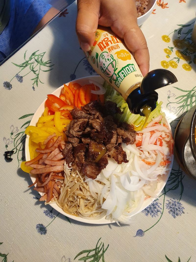 살이 5키로나 쪄서 운동 중인데 운동하고 오니 너무 배가 고프더라구요. 탄수화물은 안되겠다 싶어 마트가서 차돌냉채 재료 사고 소스는 샘표에서 나온 닭가슴살 겨자냉채 소스 사서 후딱 만들었어요.