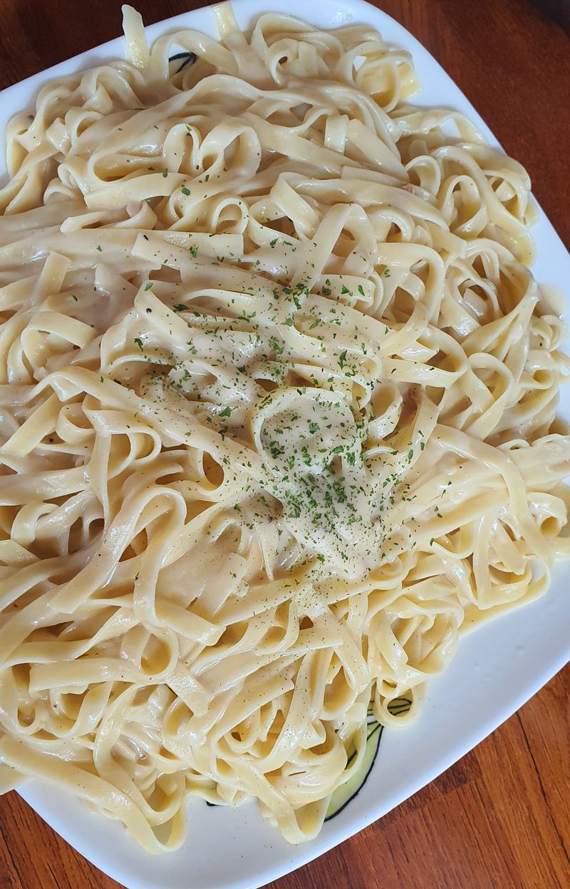 페투치네 한봉지 다 삶고, 소스도 한통 투하~ 면수 살짝 넣고 섞어주었어요ㅎ