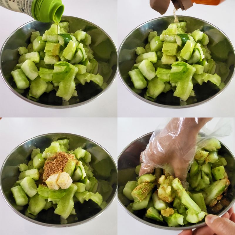 작은 크기로 쪼갠 오이를 그릇에 담은 후 양념을 할 차례에요.