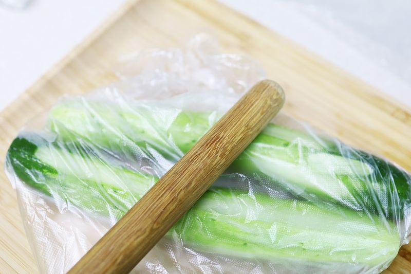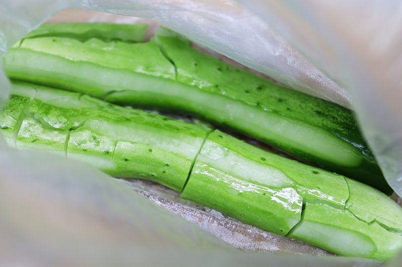 4. 오이가 조각이 나면 비닐에서 꺼낸 다음 먹기 좋은 크기로 잘라주세요.
