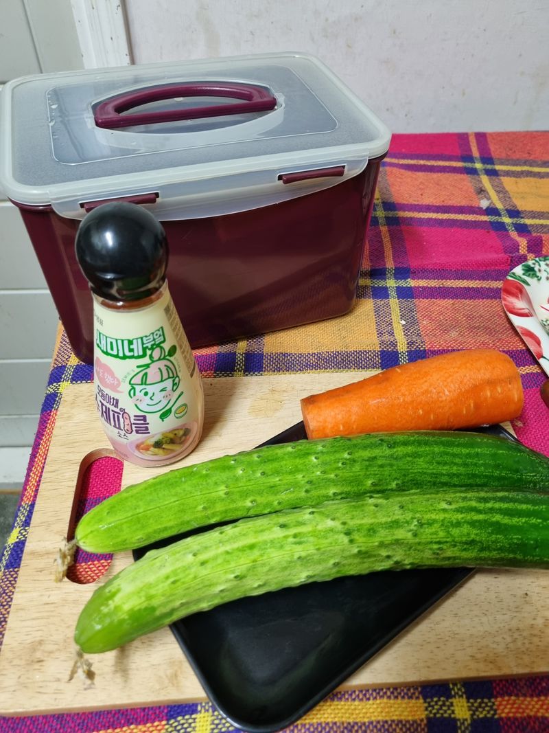 먹기 좋은 크기로 오이, 당근 등 채소 썰어주기