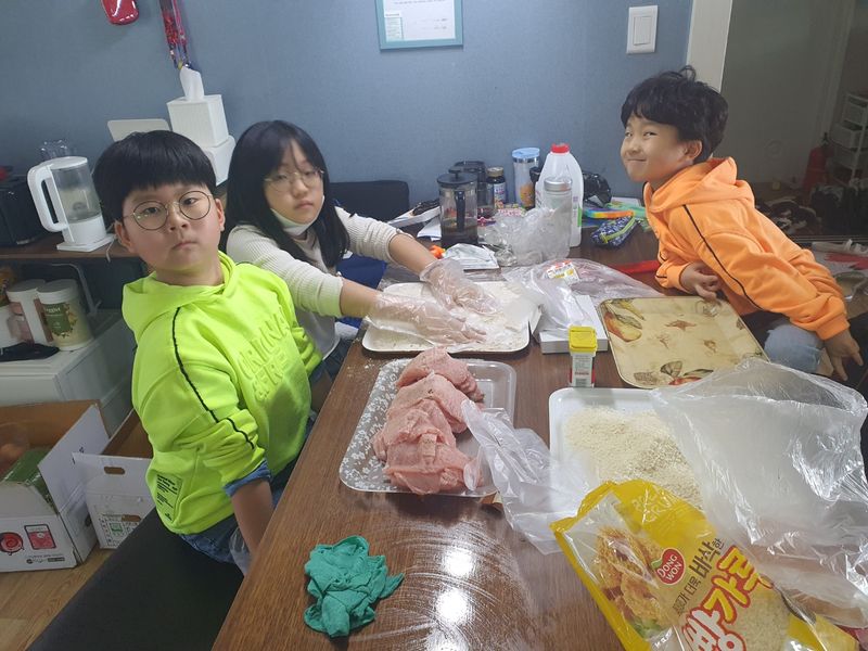 소금후추 밑간담당, 계란물담당, 튀김옷담당 이렇게 분업을 시켰더니 너무 재미있다며 깔깔 낄낄 한바탕 웃음꽃이 피었네요^^