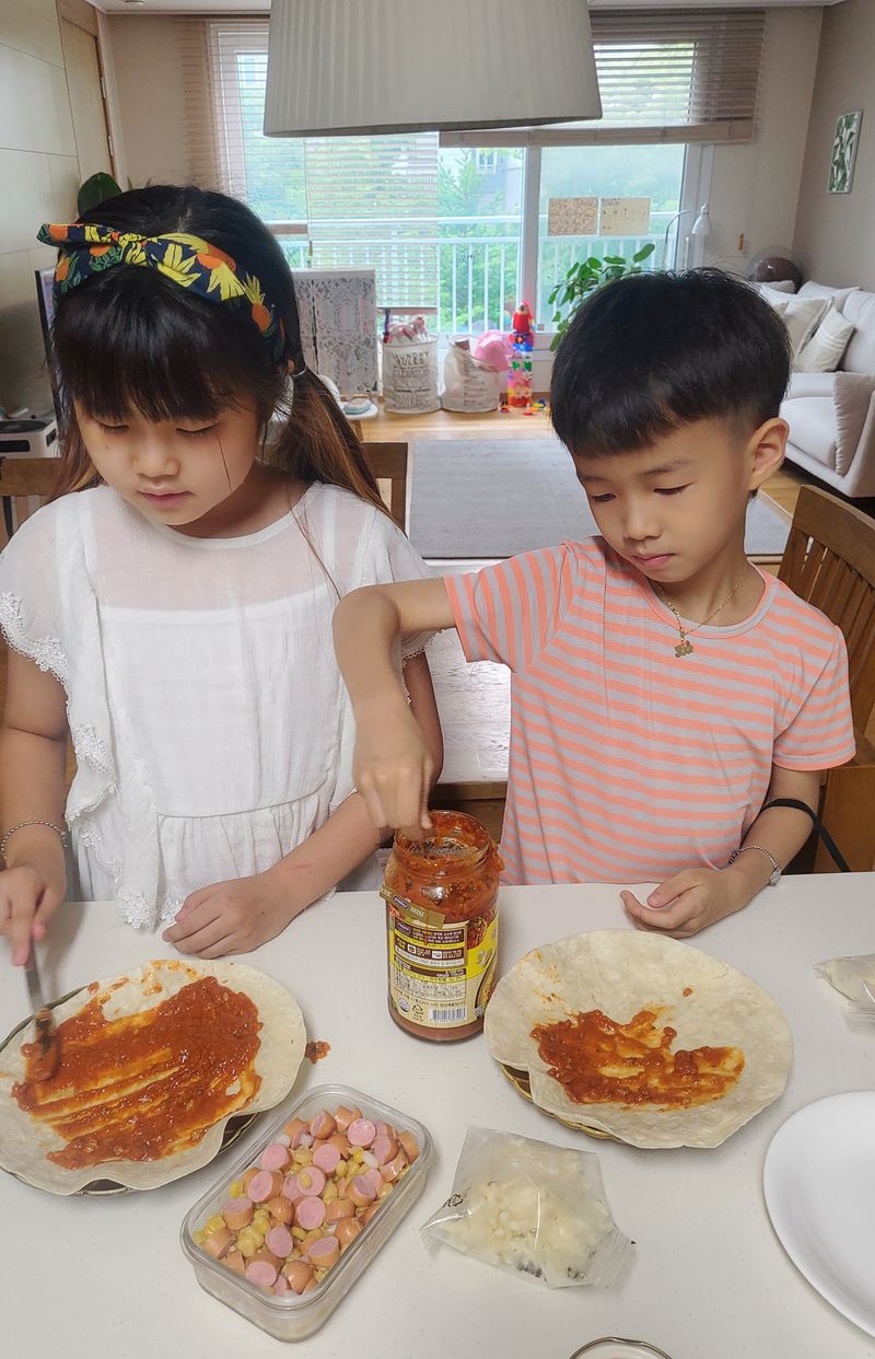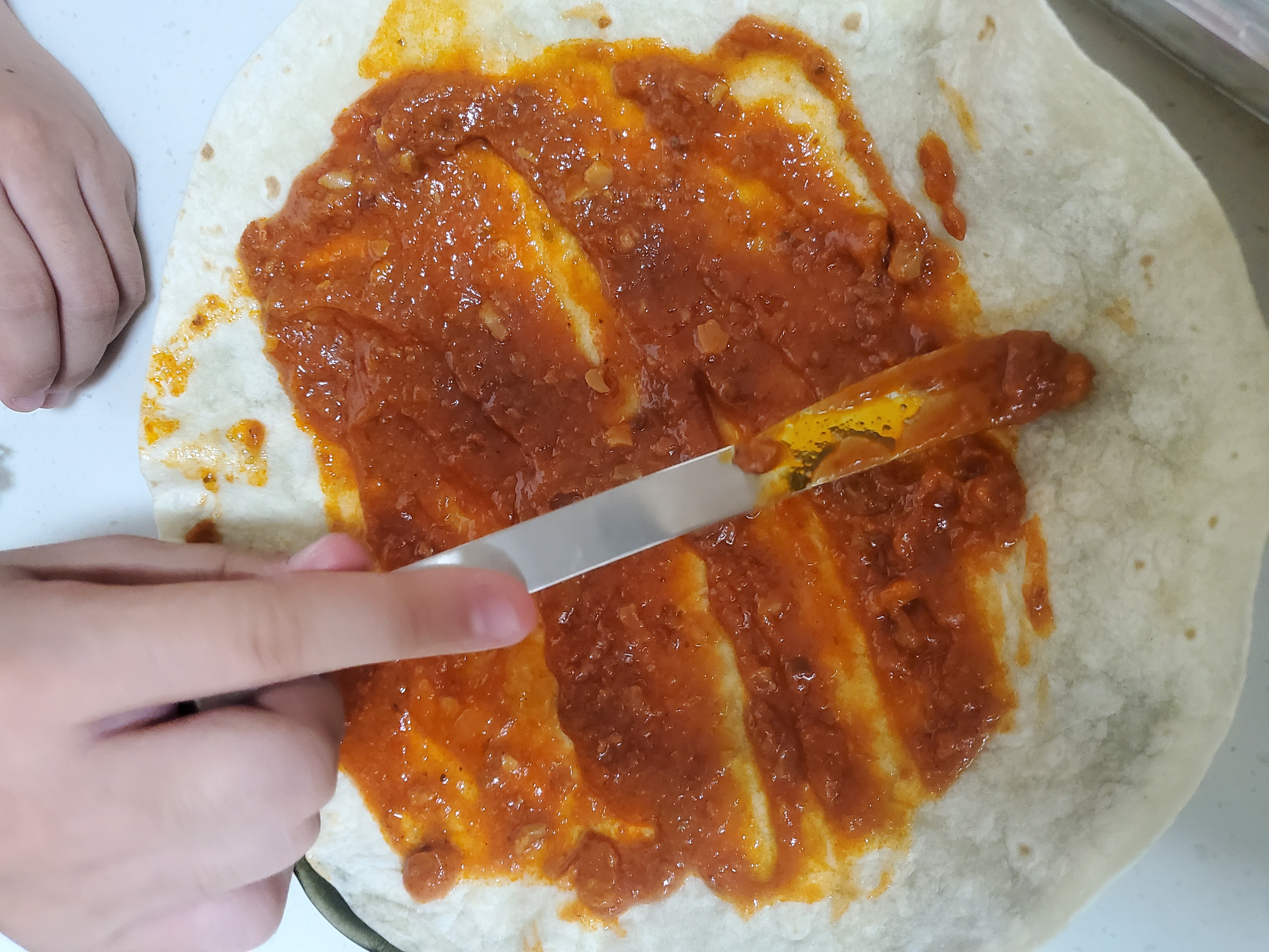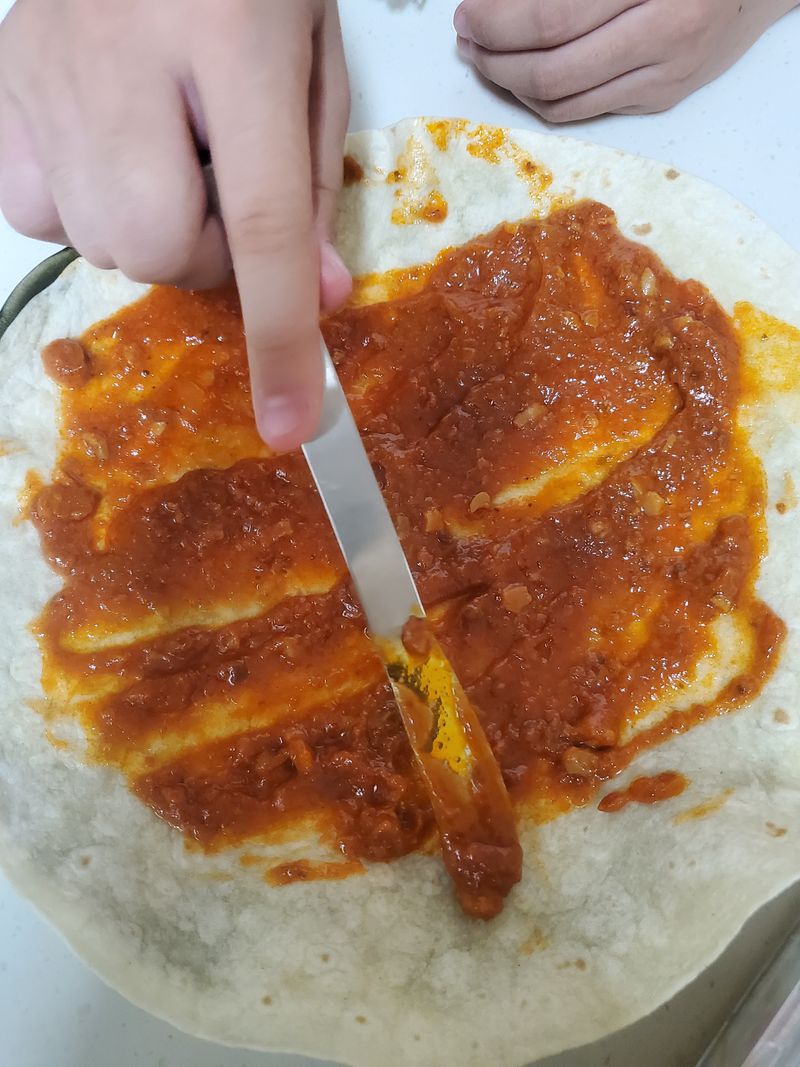 1.또띠아에 미트토마토 소스를 듬뿍 발라줍니다
