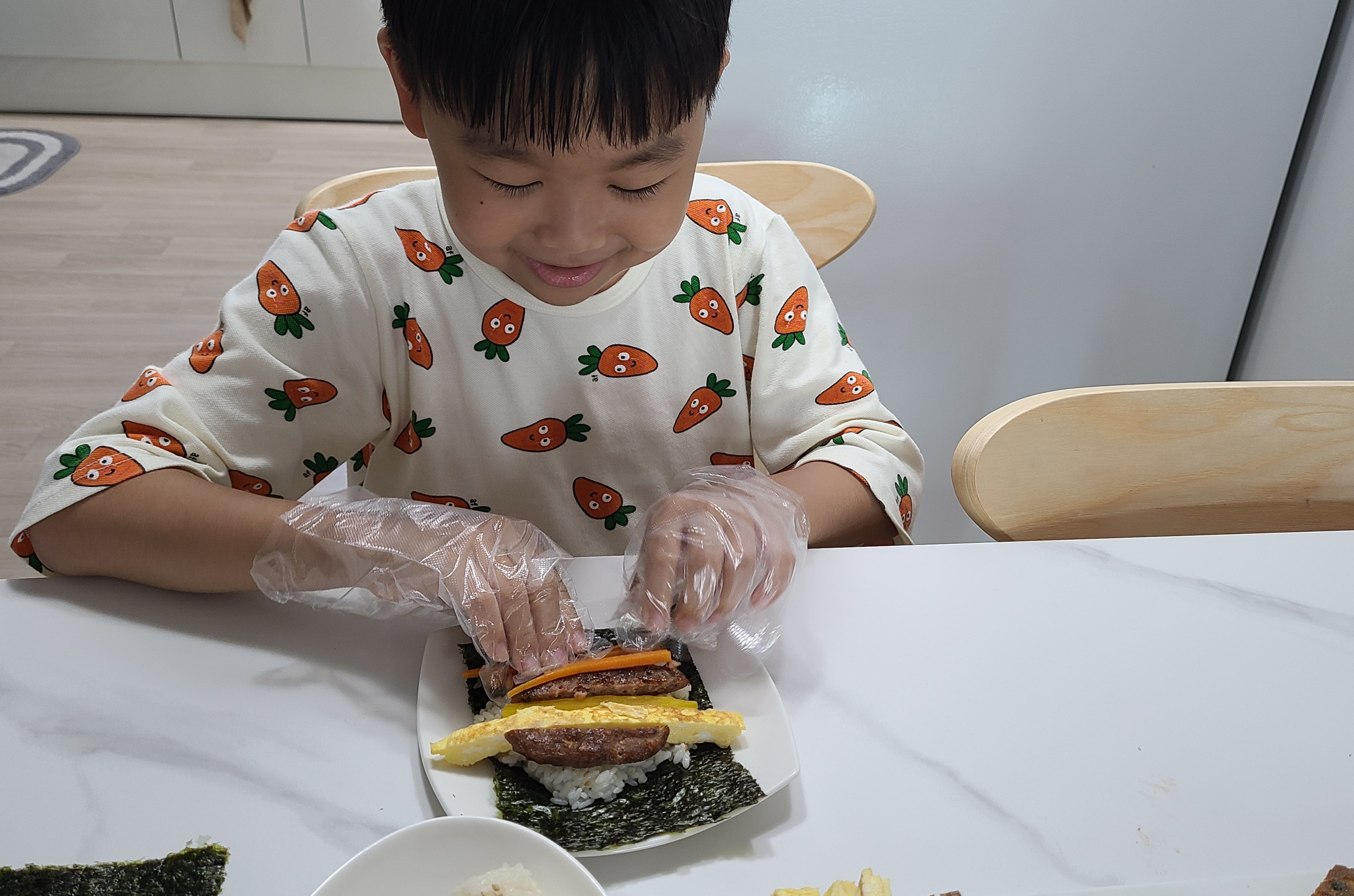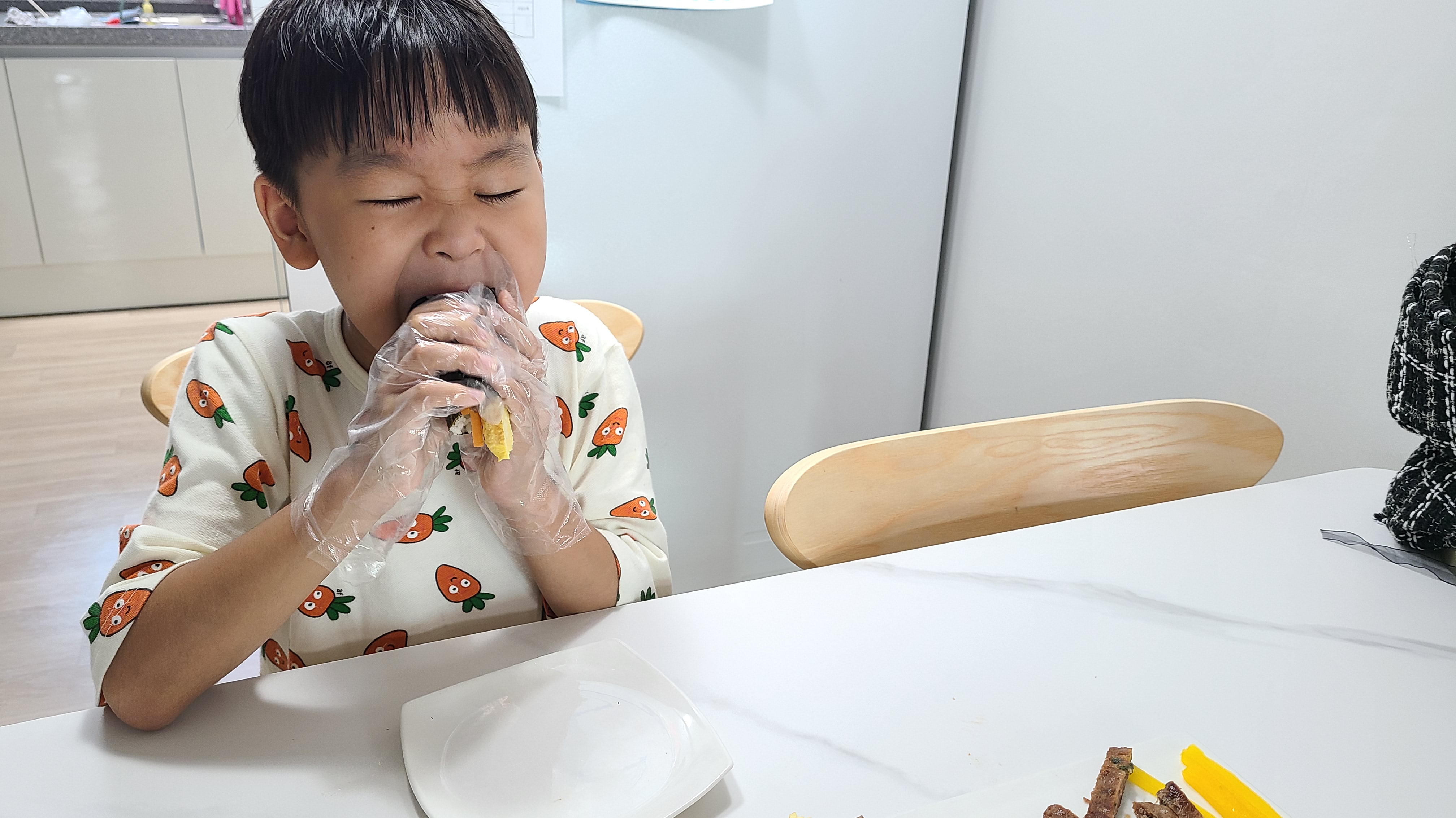 먹기 싫은건 하나만 넣고 좋아하는 떡갈비는 여러개 넣다보니 옆구리 터진 뚱뚱이 김밥이 되어버렸어요ㅎㅎ 그래도 자기가 만든 왕맛김밥♡이라고 엄청 맛있다며 잘먹었습니다~