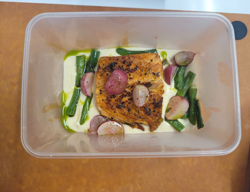 만든 연어 스테이크를 일회용기에 포장해서