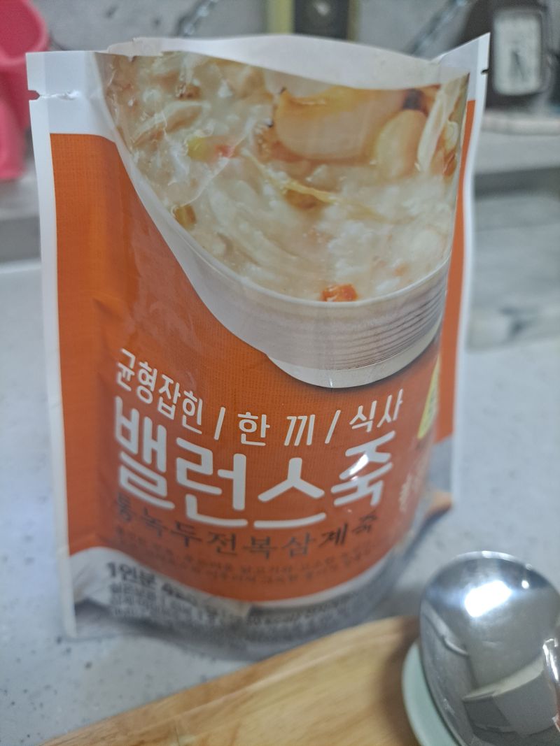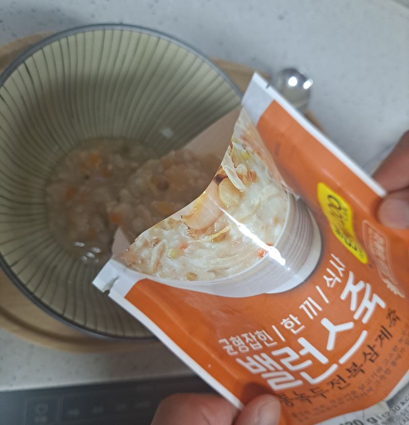 아침 6시10분 일어나 아침식사하는데 봉지상단을 뜯어 2분30분 전자레인지 돌리면 균형잡힌 한끼 식사 통녹두전복삼계줍 완성