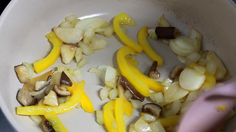 푸실리는 삶아서 익혀주고 팬에 올리브유를 두른 후 편마늘, 다진양파, 파프리카, 새송이 버섯을 넣고 볶아줍니다.
