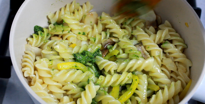 불을 끄고 바질페스토를 넣어 섞어주면 완성입니다