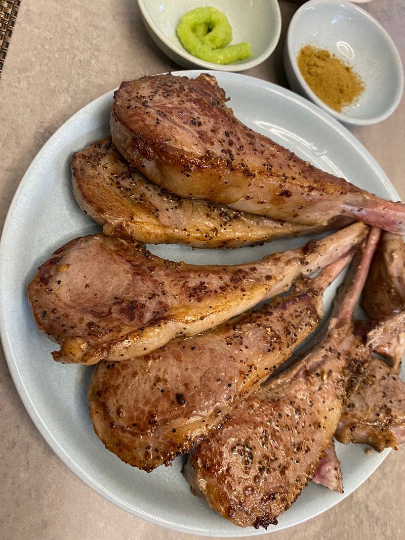 양갈비고수님이 요리해주신 양갈비입니다 올리브유 + 후추 + 월계수잎 등으로 시즈닝 후 미디엄레어로 구워낸 양갈비 증말증말 맛있습니다