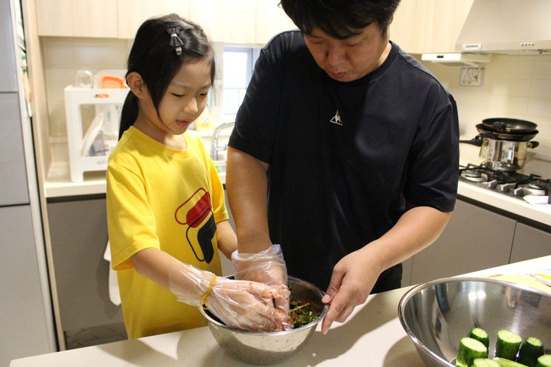 요리 활동을 참 좋아하는데, 딸 아이가 아빠와 첫 김치 요리에 도전해서 성공했습니다.