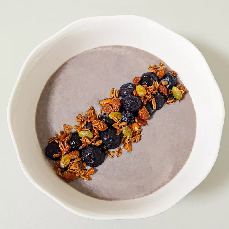 바나나 1개, 블루베리, 우유나 두유 100ml, 요거트 4스푼 (한번에 믹서기로 갈고, 토핑)