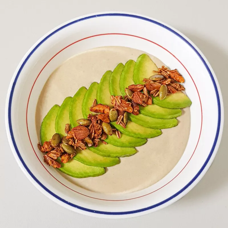 바나나 1개, 아보카도 1/4개, 우유나 두유 100ml, 요거트 4스푼 (한번에 믹서기로 갈고, 토핑)