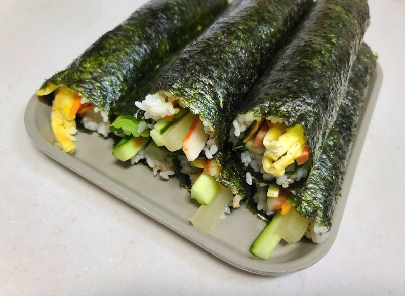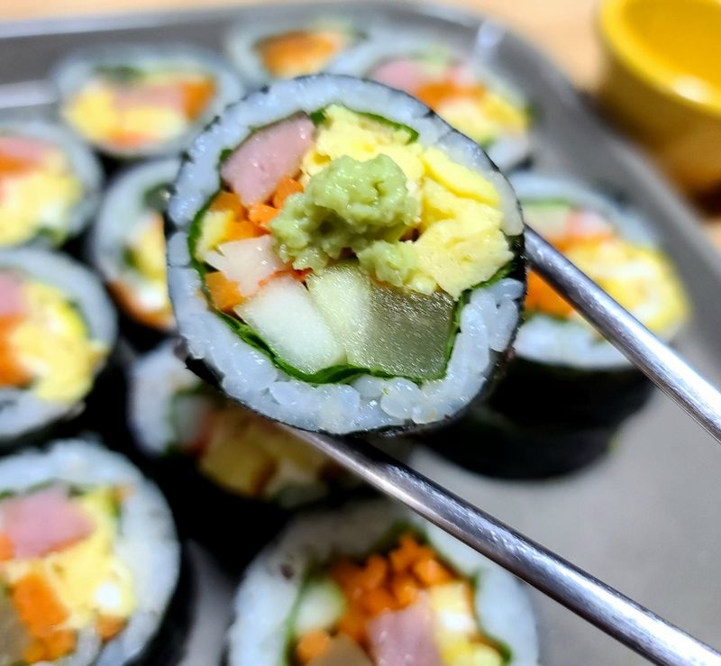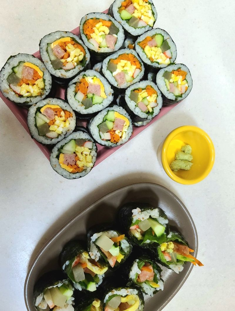 집김밥은 맛없없이에요. 무한정 들어가는 집김밥 어째요😵 어제 저녁에 신랑도 회식한다길래 김밥말았어요. 집에 김밥김과 김밥단무지는 필수품이라🤭 야무지게 말아서 저는 와사비와 함께 합니다. 히힛😆🤤