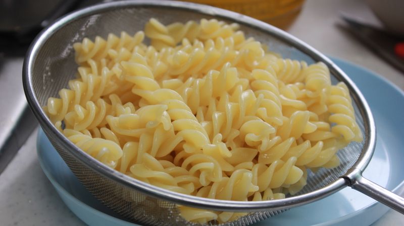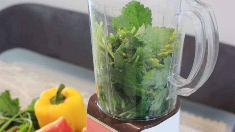 참나물 페스토를 만들어 익혀 놓은 푸실리 파스타에 넣고 섞어주었는데요