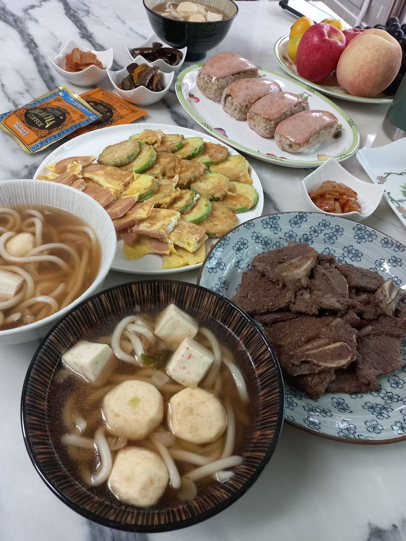 스팸무스비, 갈비, 분홍소시지,호박부침개,커피 .사과,귤,포도,복숭아 과일까지