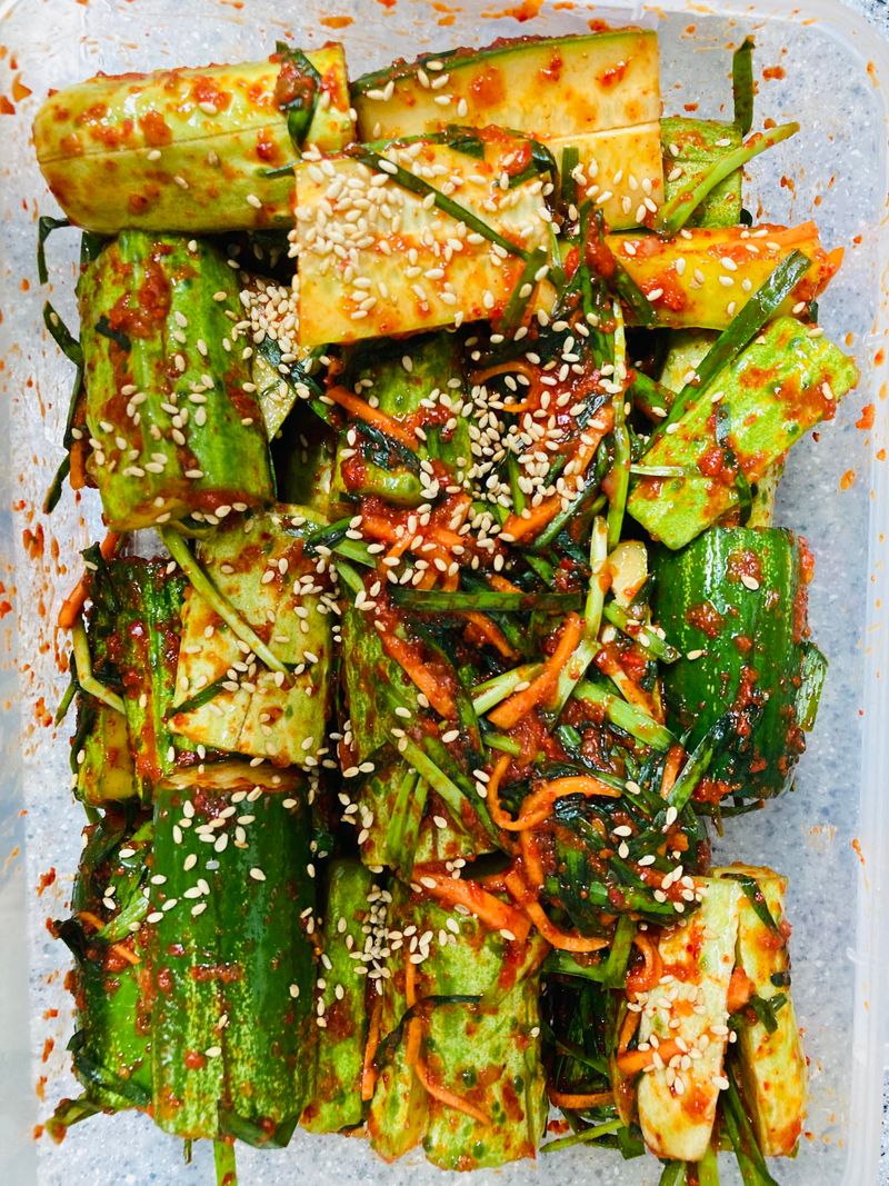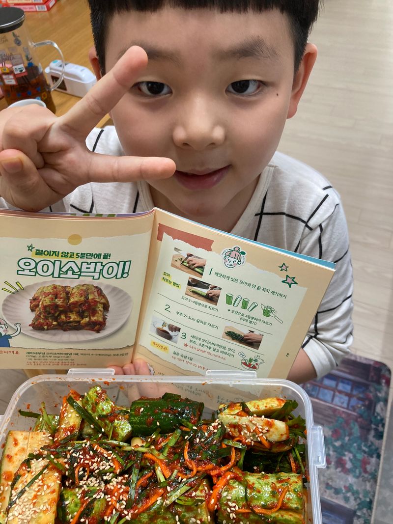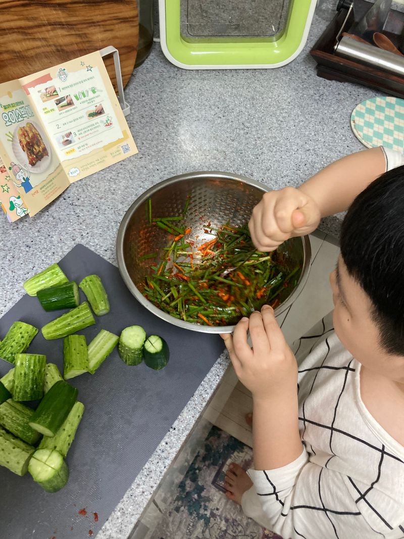 주말마다 만나는 아빠를 위해! 꼬마요리사 출동! 제철 맞은 백다다기 오이를 선택! 재료 모두 썰어서 새미네 오이소박이 양념장에 맛있게 버무리니 금방 뚝딱! 음식의 마무리는 깨로 솔솔뿌려 마무리 하면 더 맛있다고 살짝 꼬마요리사가 귀뜸해 주네요! 하루 숙성뒤 파스타와 함께 먹으니 진짜 환상적인 짝궁! 이제 피클대신 오이소박이로 먹겠다는 군요! 주말에 만날 아빠도 완전 반할 맛이겠죠!
