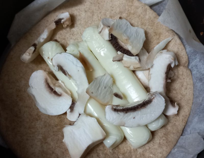 그리고 또띠아한장에다가 스트링 치즈 세개쯤 올리고 양송이 한개 썰어서 에프에 돌려주고요? 요것도 치즈가 노릇노릇해지면 꺼내세요. 또띠아가 확 탈 수도 있어서 너무 높은 온도는 노노~~저는 치즈 노릇해지라고 욕심 부리다가 쬐매 타기 직전이 됬는데 이건 이거 나름으로 또띠아가 바삭하니 과자같아져서 넘 맛있어요 ㅎㅎ