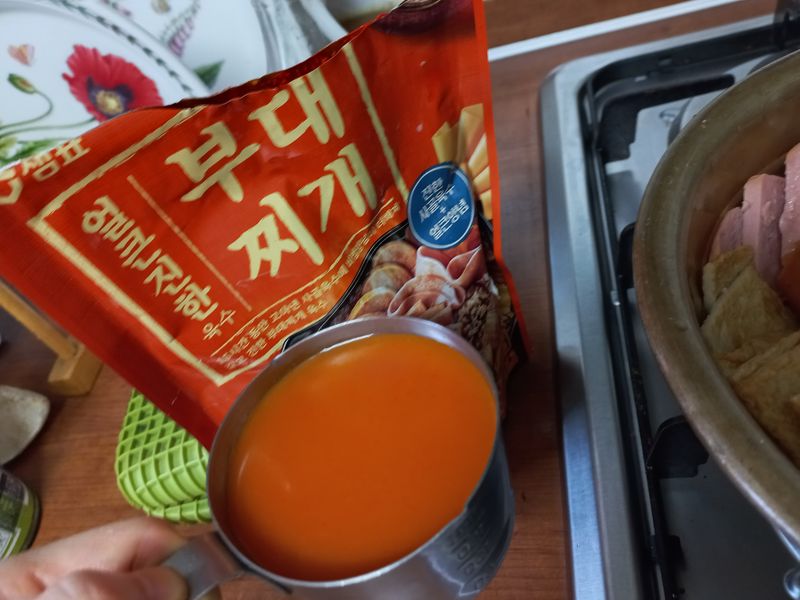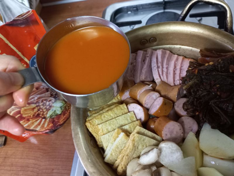 4. 치트키 두번째! 샘표 부대찌개 육수+물 넣기