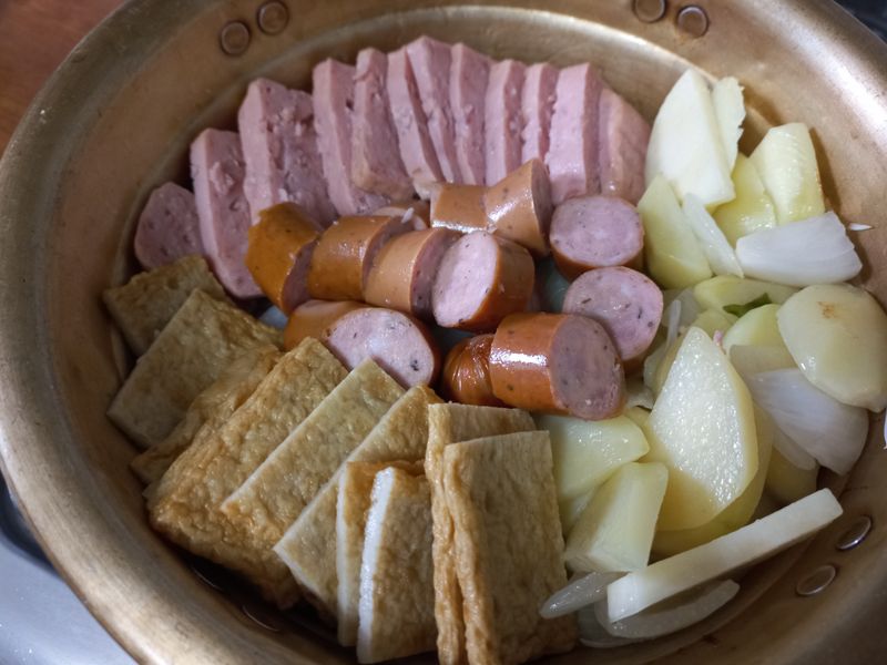 2. 리챔이랑 부어스트 오뎅 썰어서 같이 얹어주기
