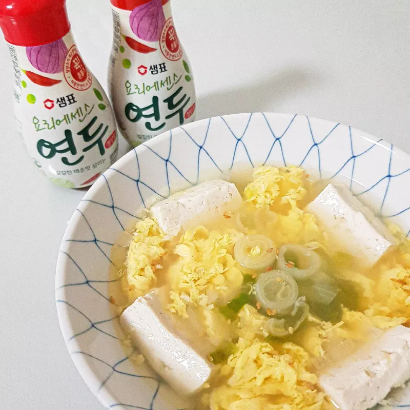 양념과 재료가 간단해서 연두와 함께라면 누구나 쉽게 만들어볼 수 있는 두부계란국이에요. 저는 매콤하고 알싸한 맛을 좋아해서 연두에센스 청양초맛과 청양고추를 추가했어요.