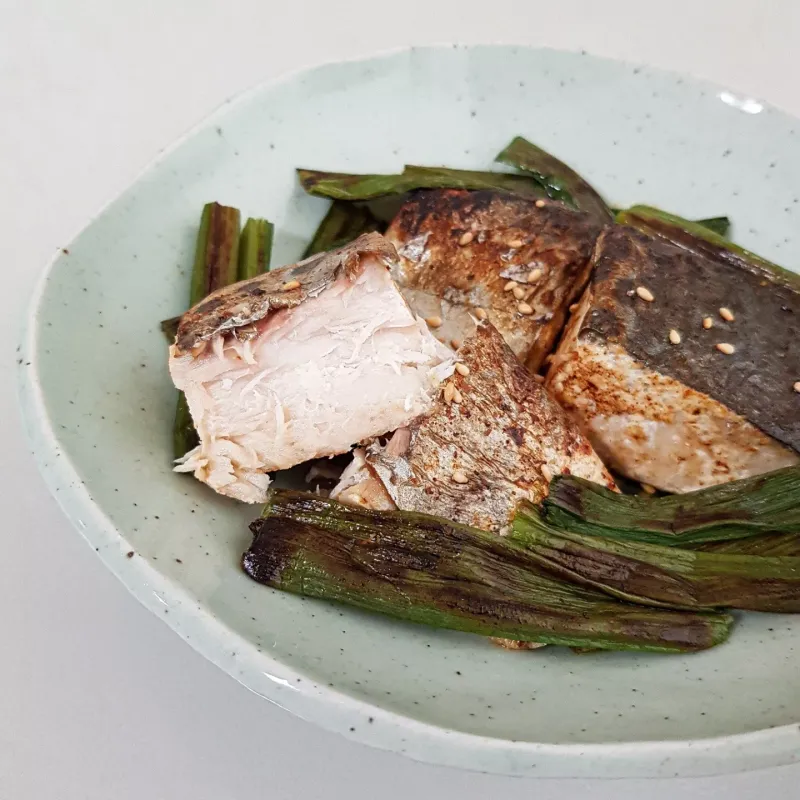 부족한 단백질은 삼치파구이로 채웠는데요 🐟❤ 삼치랑 파를 노릇노릇 구운 후, 샘표 새미네부엌 양파절임소스를 뿌렸어요.