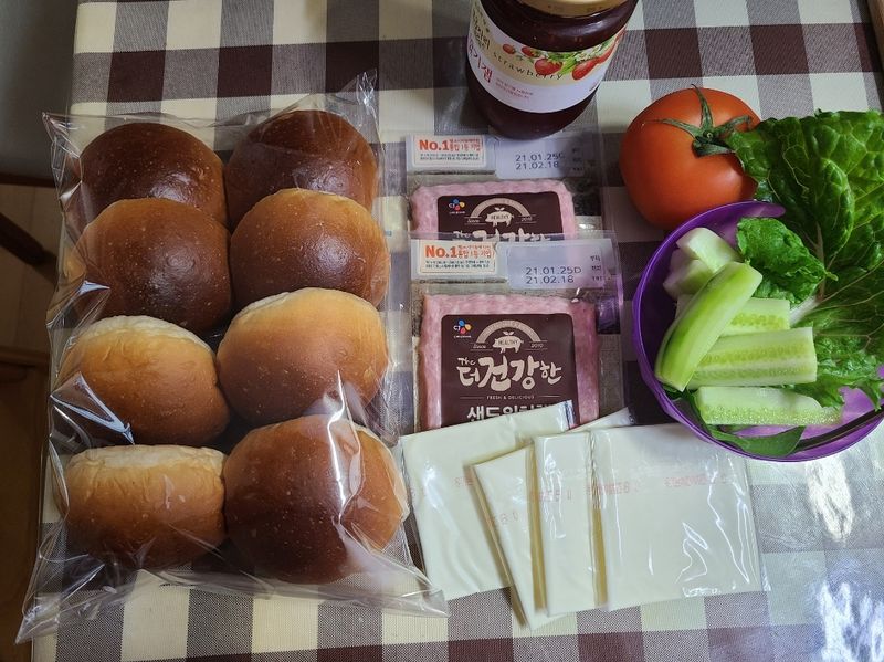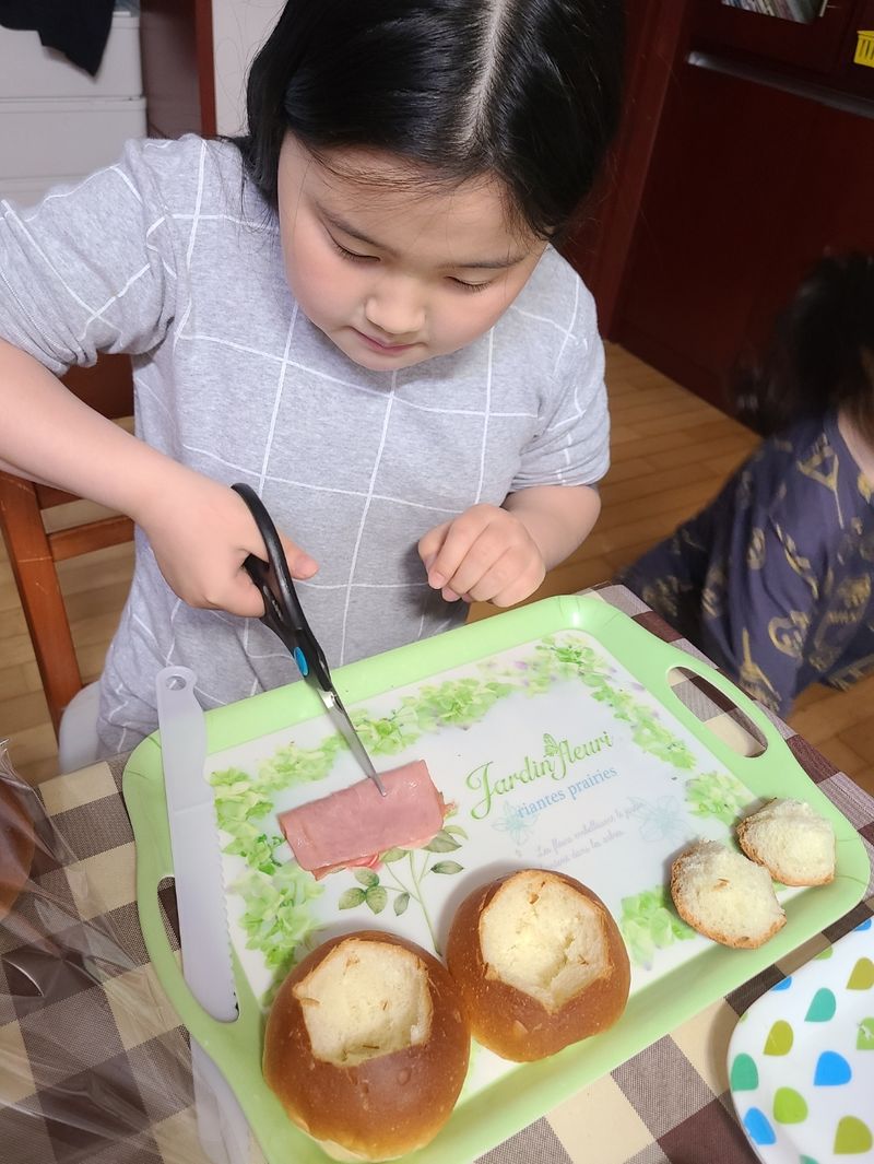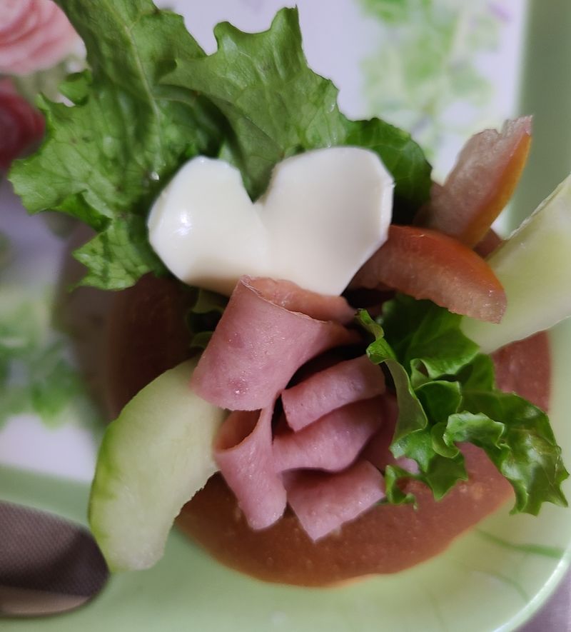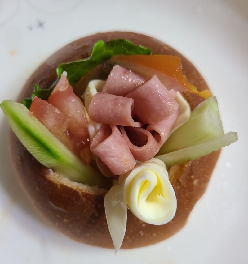 샌드위치 용 햄을 꽃처럼 만들어서 샌드위치를 만들고 치즈와 오이등으로 꾸미니
