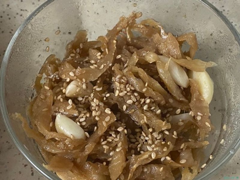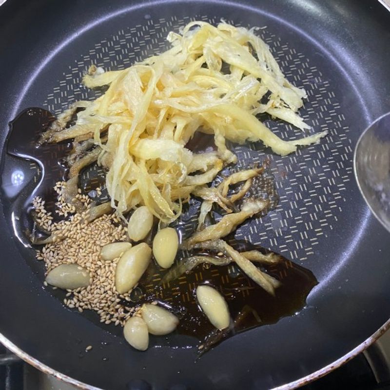 진미채 같은 건어물을 그냥 고추장소스로 해도 좋은데 단짠 소스로 넣으면 은근히 담백한데 밥도둑이라 도시락으로도 자주 해가요 오늘은 새미네부엌 멸치볶음소스+참기름 2스푼+깨+마늘 +쪽파+샘표 간장 2스푼 넣어서 기름둘둘돌려 센불에 불린 황태를 쭈욱 물기짜서 조림햇는데, 밥도둑이에요