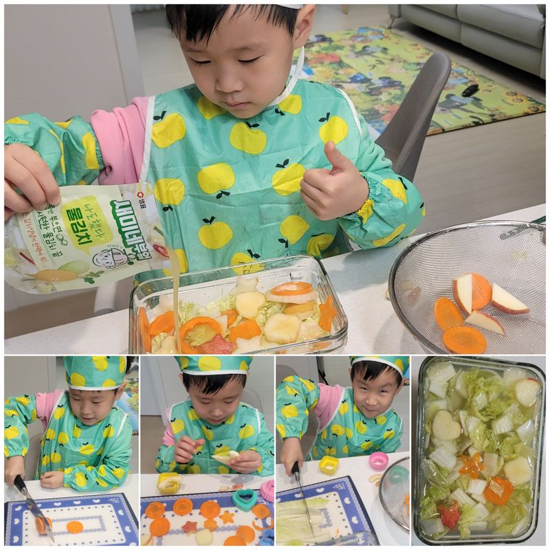새미네부엌 나도했다 물김치를 만들기 전 위생을 위해 깨끗이 손을 닦고 머리두건, 앞치마, 손토시를 했어요. 당근 사과 배는 모양틀로 예쁘게 모양을 내어 훨씬 먹음직스럽게 보인답니다!