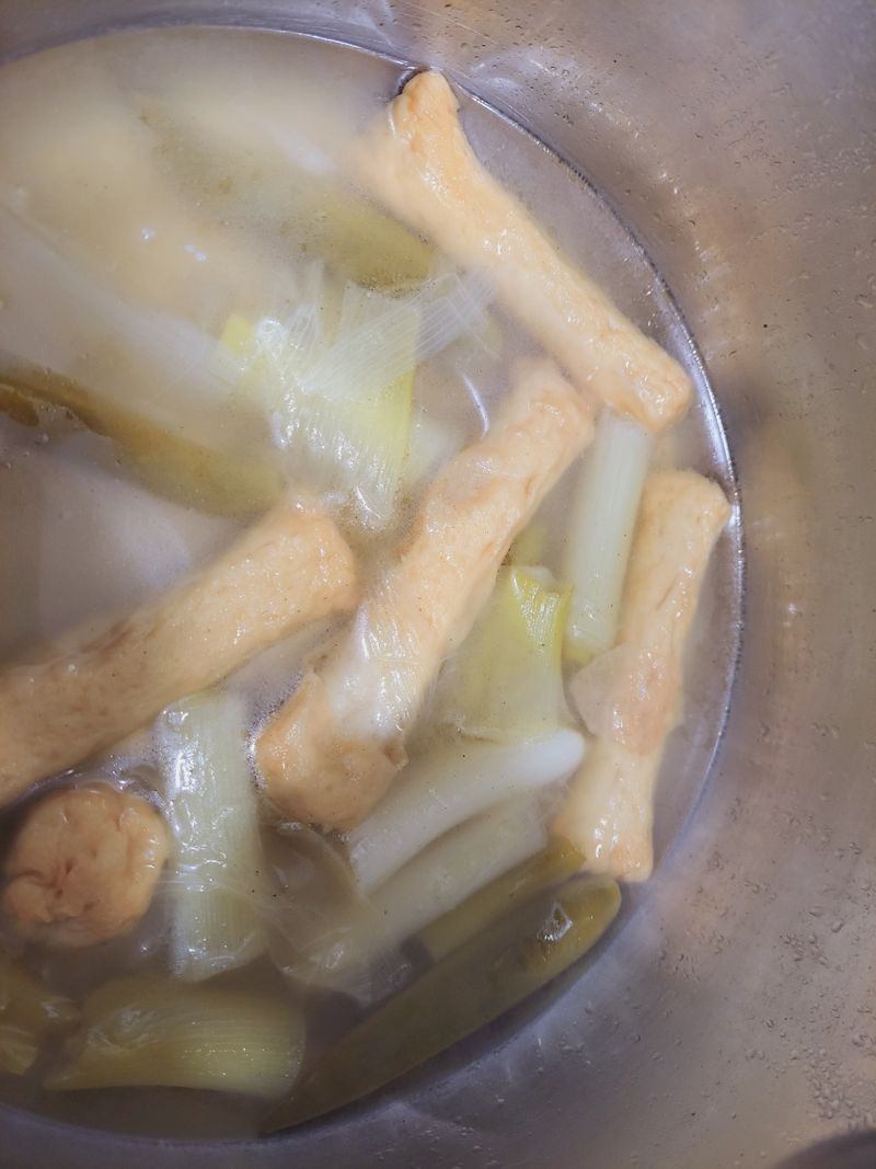 물에 넣고 삶아주다가 파와 만능육수를 넣어주고 다시 팔팔 끓여요