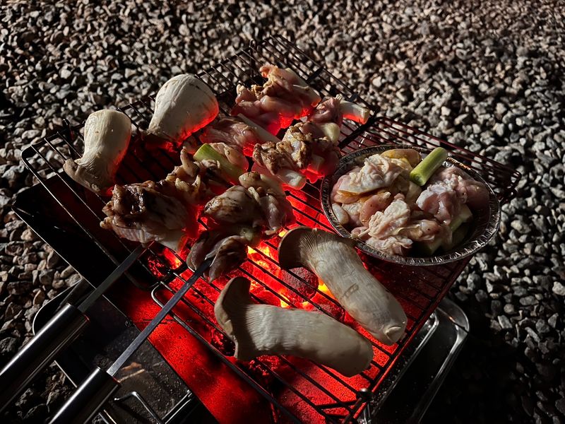 닭다리살을 소금 톡톡 , 카레가루에 조물조물 재워서 대파나 마늘과 함께 끼워 숯불에 구우면 그냥 먹어도 맛있고, 카레와 같이 먹어도 맛있어요!