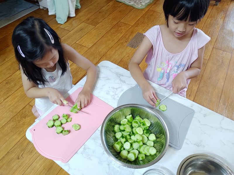 아이들과 함께 오이와 양배추를 씻고, 자르고 모양 커터로 모양을 내고, 새미네부엌 피클 만들기 재료로 함께 피클을 만들면서 오이와 친해지고 아이 스스로 만들면서 편식을 없애고 피클 접해보기 .