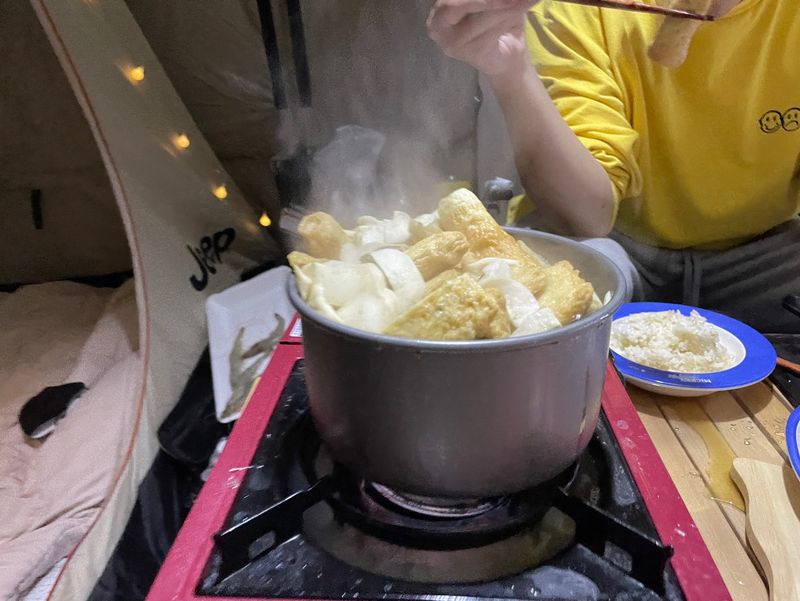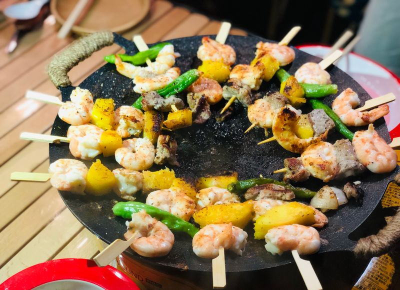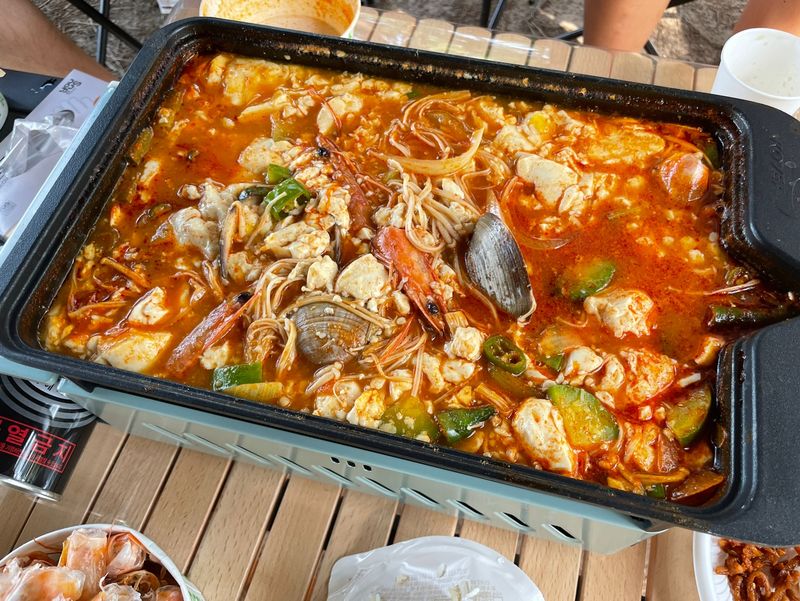 이번캠핑에서는 가을철 별미! 제철음식인 대하를 이용하여 가을을 흠뻑 느껴보았답니다! 뭐니뭐니해도 캠핑은 만들어서 먹는 즐거움이 제일 크잖아요?~ㅎㅎ 먼저 대하구이와 대하꼬치구이를 메인으로 다양한요리를 만들어 보았어요~ 대하꼬치구이는 소금후추,칠리소스,고추장소스 3가지 양념을 이용하여 총 3판을 만들어서 먹었는데 정말 순식간에 사라지는 마법이... 맛이 정말 최고였답니다👍 대하소금구이는 역시! 초장에 찍어서 먹으면 정말 꿀맛! 이외에도 시원한바지락순두부찌개, 단짠콘치즈, 뜨끈뜨끈어묵탕, 하트볶음밥, 역시돈마호크,달콤한딸기쨈핫케이크까지 눈과 입이 즐거운시간이었어요~ 요리는 만드는 과정에서 손이 많이 가지만 완성후 직접 만들었다는 뿌듯함과 사랑하는 사람들과 함께 먹는 맛이 요리의 즐거움이 아닐까 싶네요