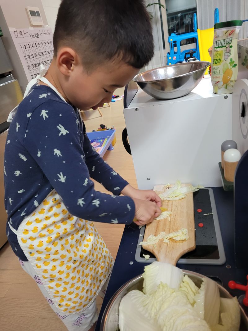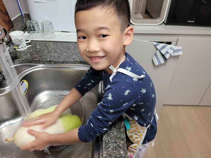 #맛있는추억을그리다#함께요리챌린지 알배추와 무로 물김치 담그기도전~~ 재료를 깨끗이씻고 자르고 물김치소스만 부어서 조물조물해주면 나만의 물김치 완성!! 물김치 익으면 배추와 무 먹어보기로 약속한 꼬맹이~~