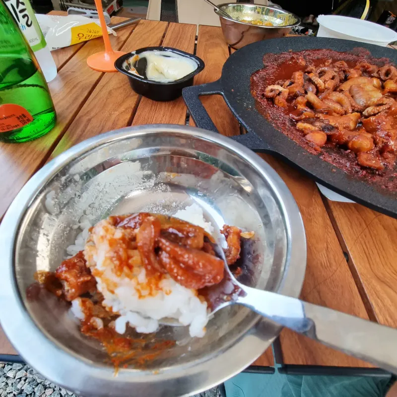 다음날 철수인데, 쭈꾸미와 곱창이 남아 뭘 먹지 고민하다가 둘을 같이 볶아먹었는데 너무 맛있더라고요:) 양념된 쭈꾸미와 냉동곱창 한팩 해동시켜 같이 볶아주면 끝. 특히, 마요네즈소스와 함께 먹으면 매운 맛도 중화시켜주고 최고에요!
